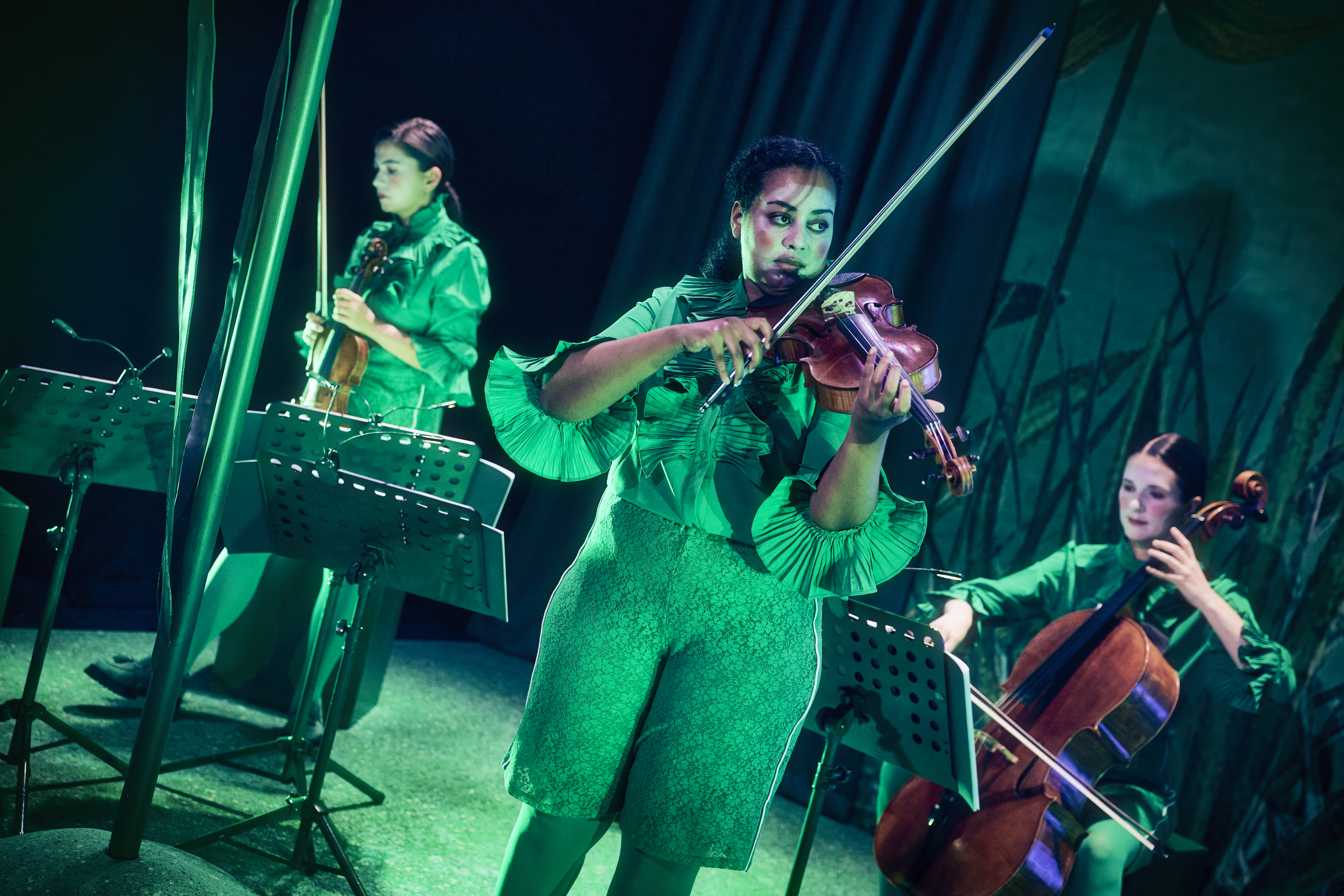 På scenen bringer tre operasangere og fire musikere eventyrets figurer og naturens lyde til live i et magisk rum skabt af scenograf Katrine Gjerding og lysdesigner Thora Eriksen.
